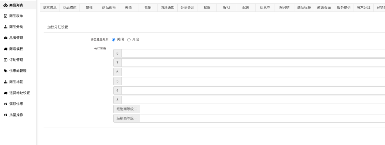 商品可单独设置,商品设置优先于统一设置;如果商品开启了独立但是没设置,那么该商品不参与加权分红